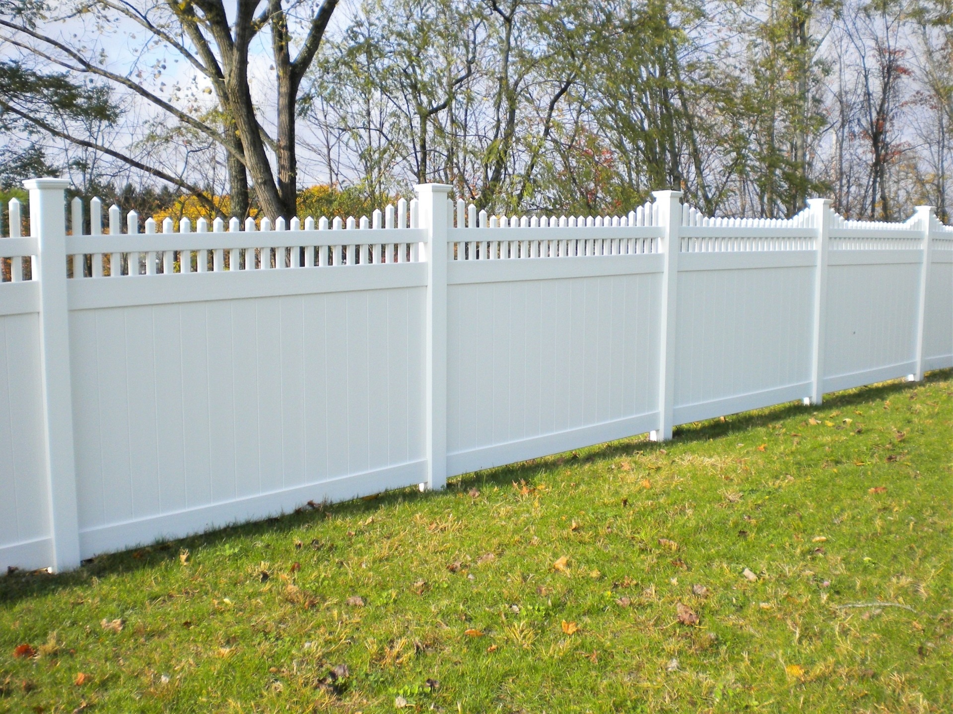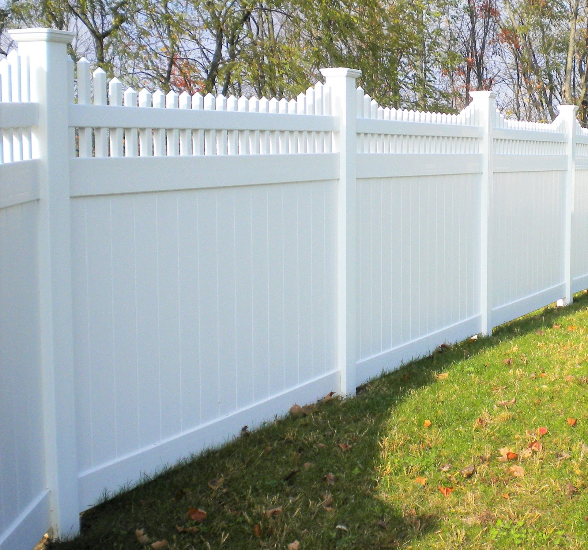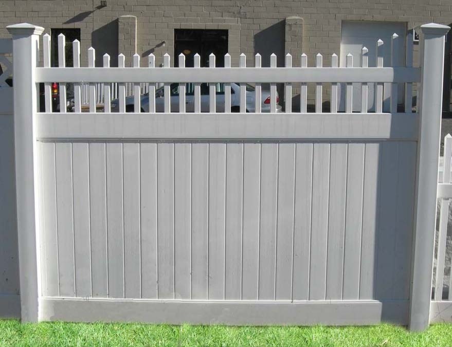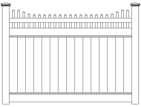 Classic Privacy 2 has pickets extending through the top rail forming a stepped row. This attractive vinyl fence style is built strong with 2” x 7” decorative pocket rails, 6″ wide vertical boards, and metal reinforced bottom rail.