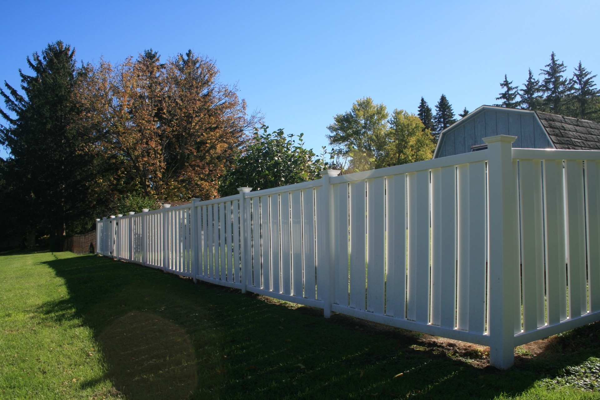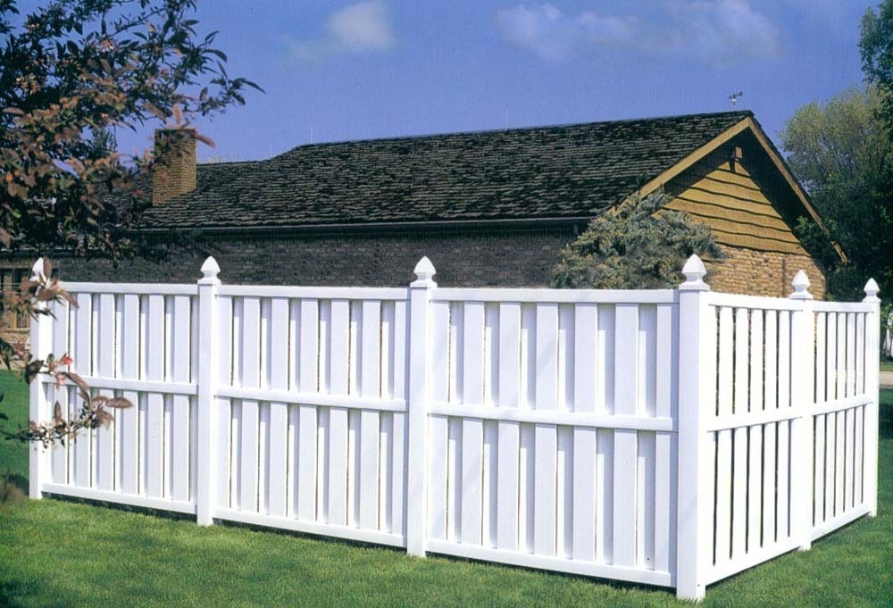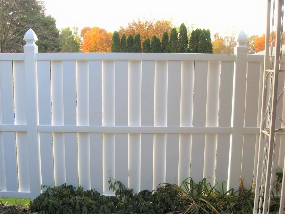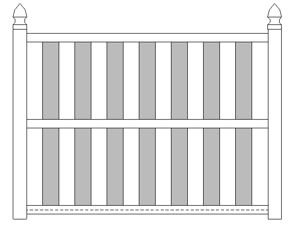 This unique fence style appears to have no picket spacing when viewed straight on, but when viewed from an angle the spaces appear. Made with 6″ pickets, 3″ x 3″ rails, metal reinforced bottom rail.