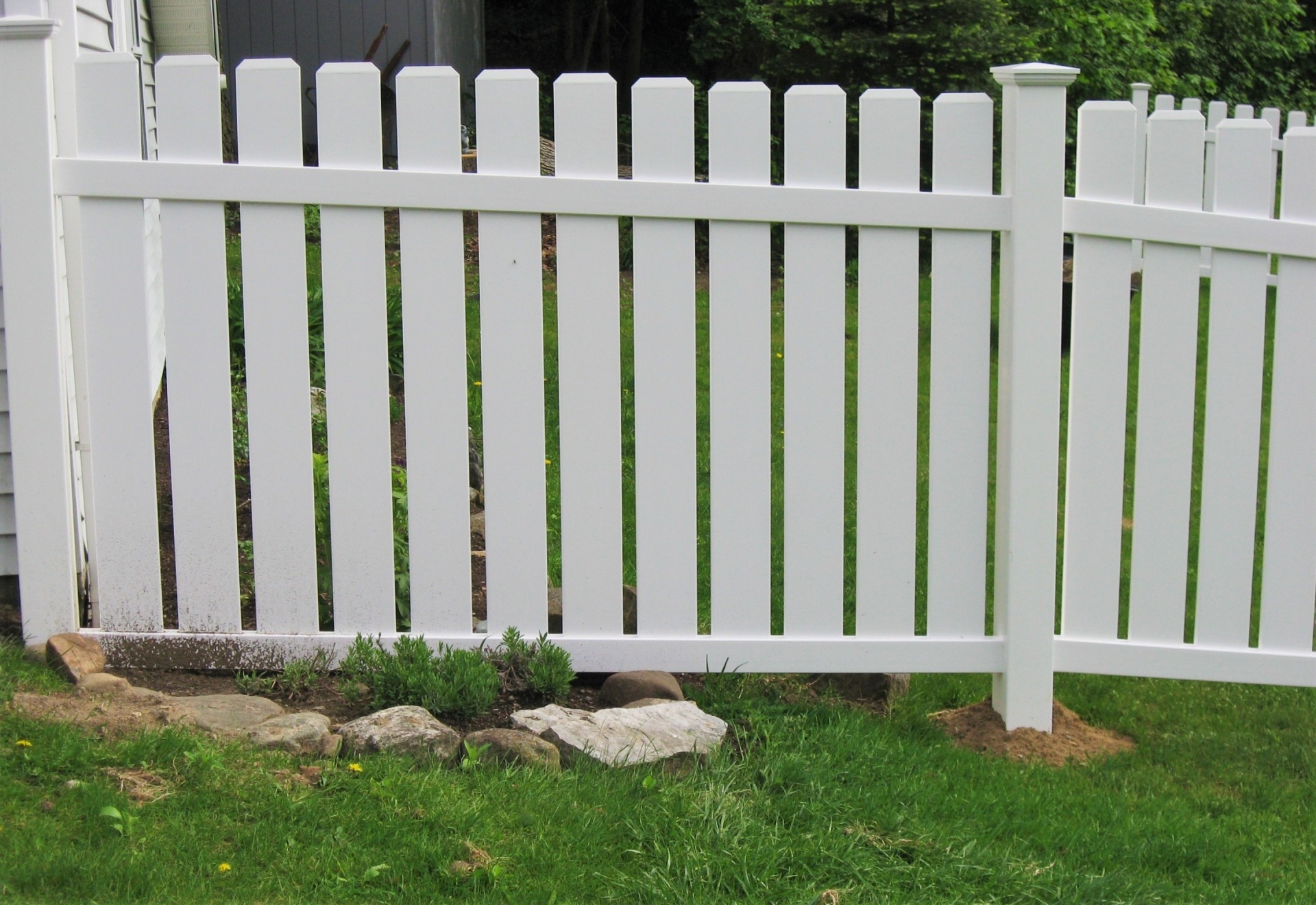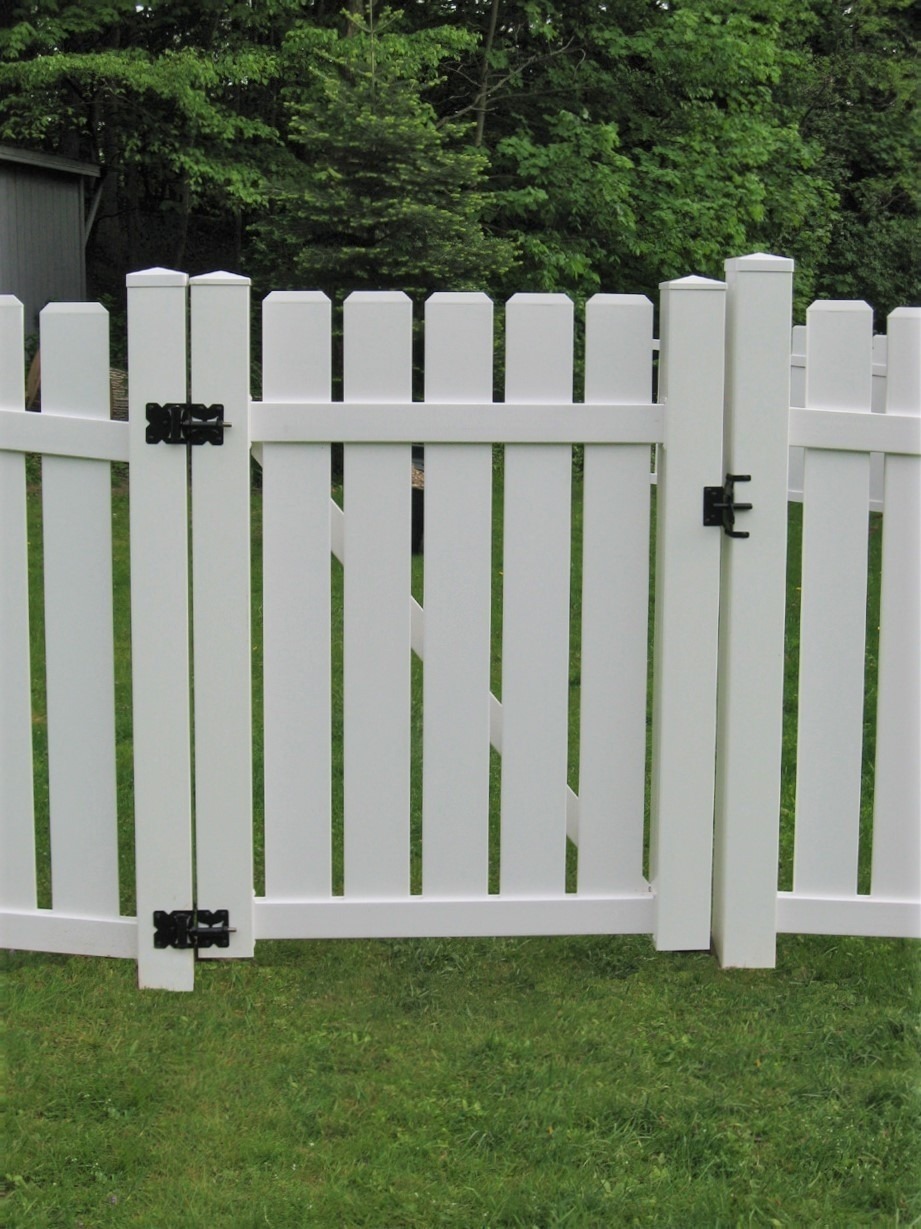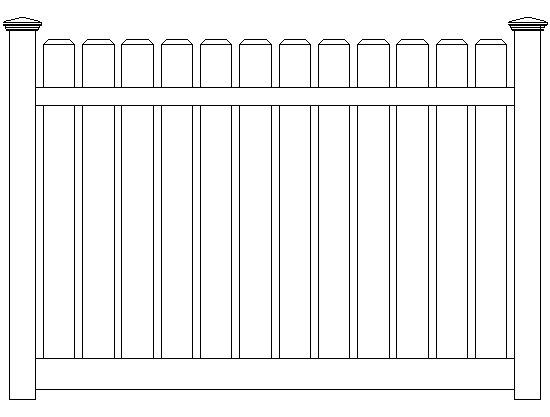 This “wide board” vinyl picket fence is a classic with narrow gaps between the pickets and an overall sharp clean look. Made with 6″ pickets and 3 ½” rails, and a metal reinforced bottom rail.