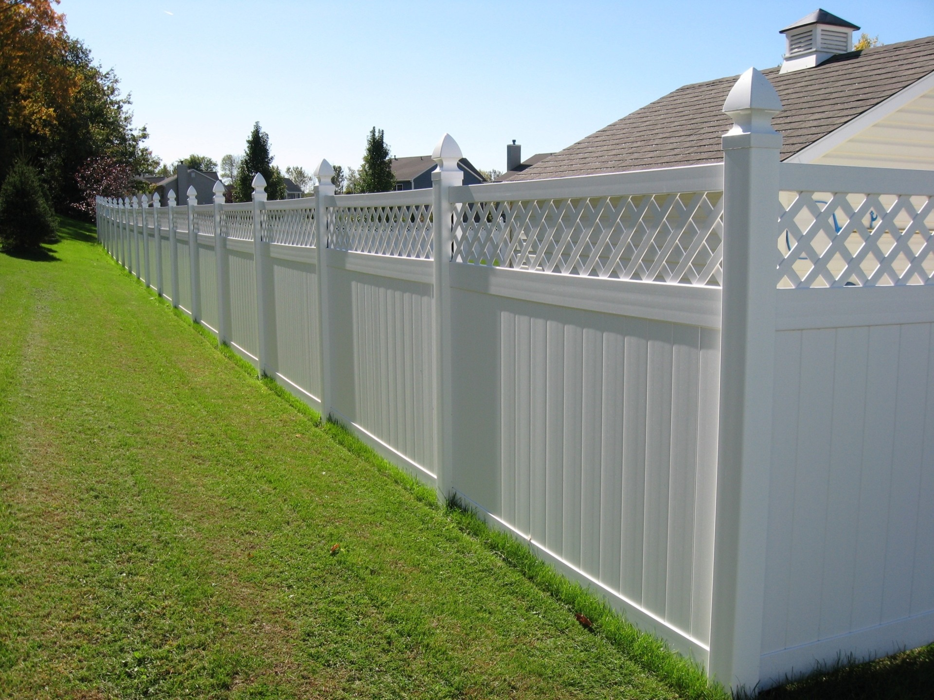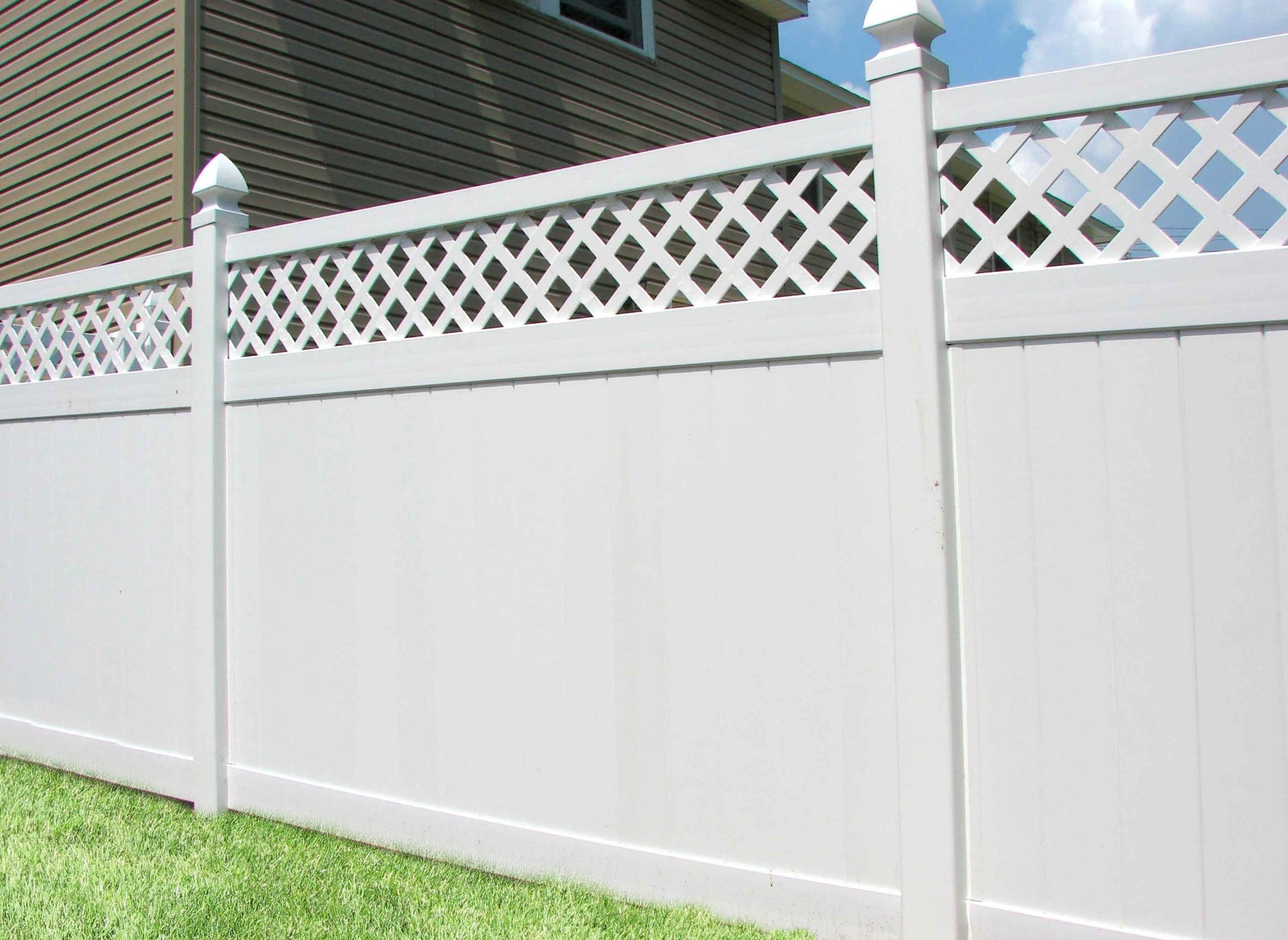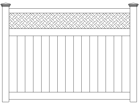 Highland vinyl fence is topped with diagonal lattice and supported by 6” wide vertical boards, 1.5” x 5.5” pocket rails, and metal reinforced bottom rail.