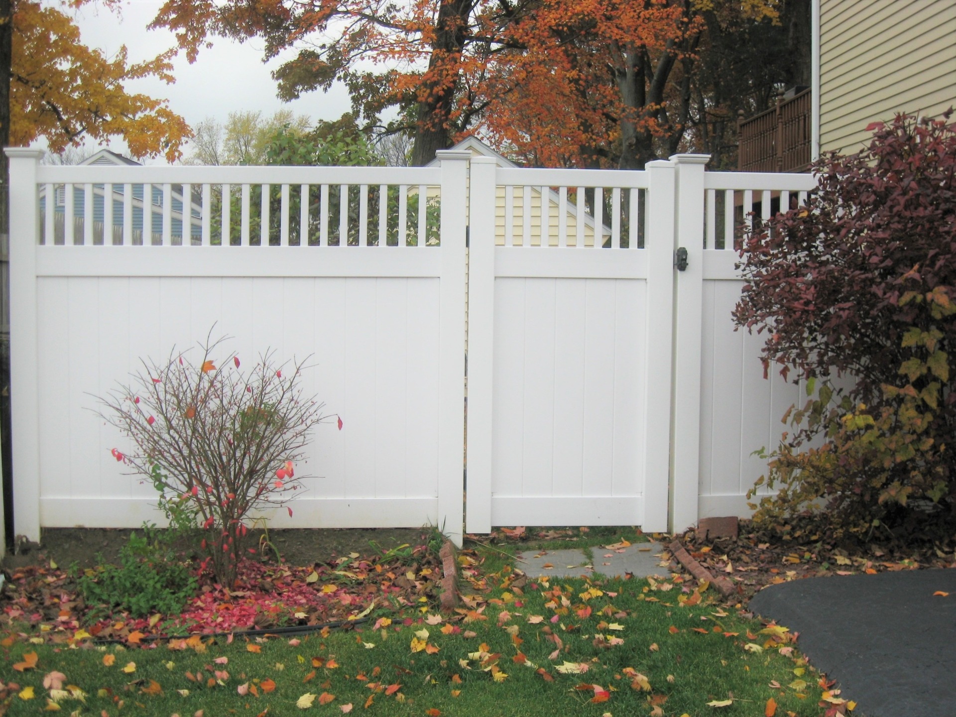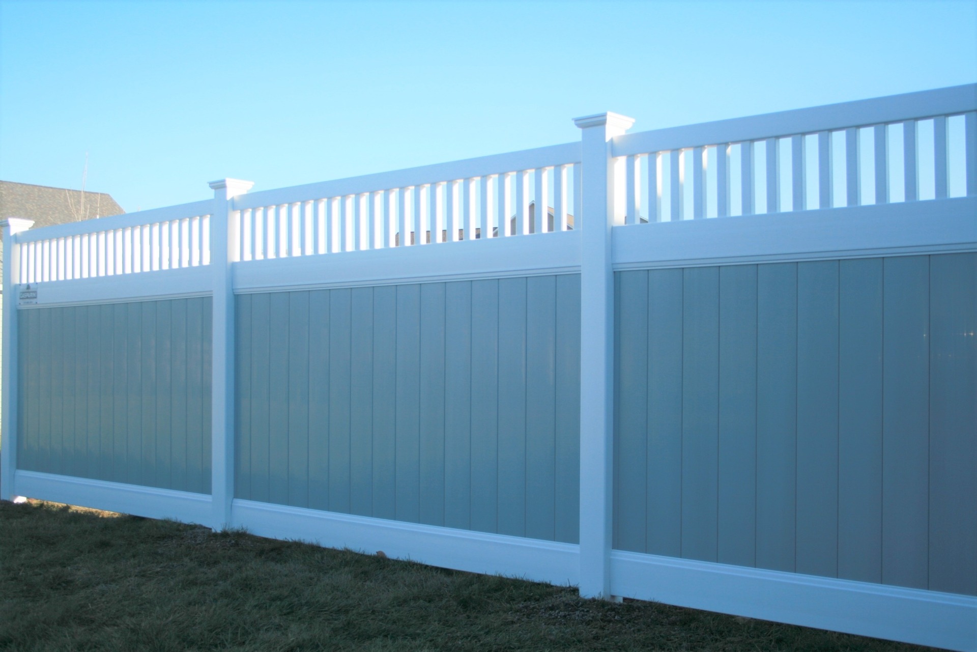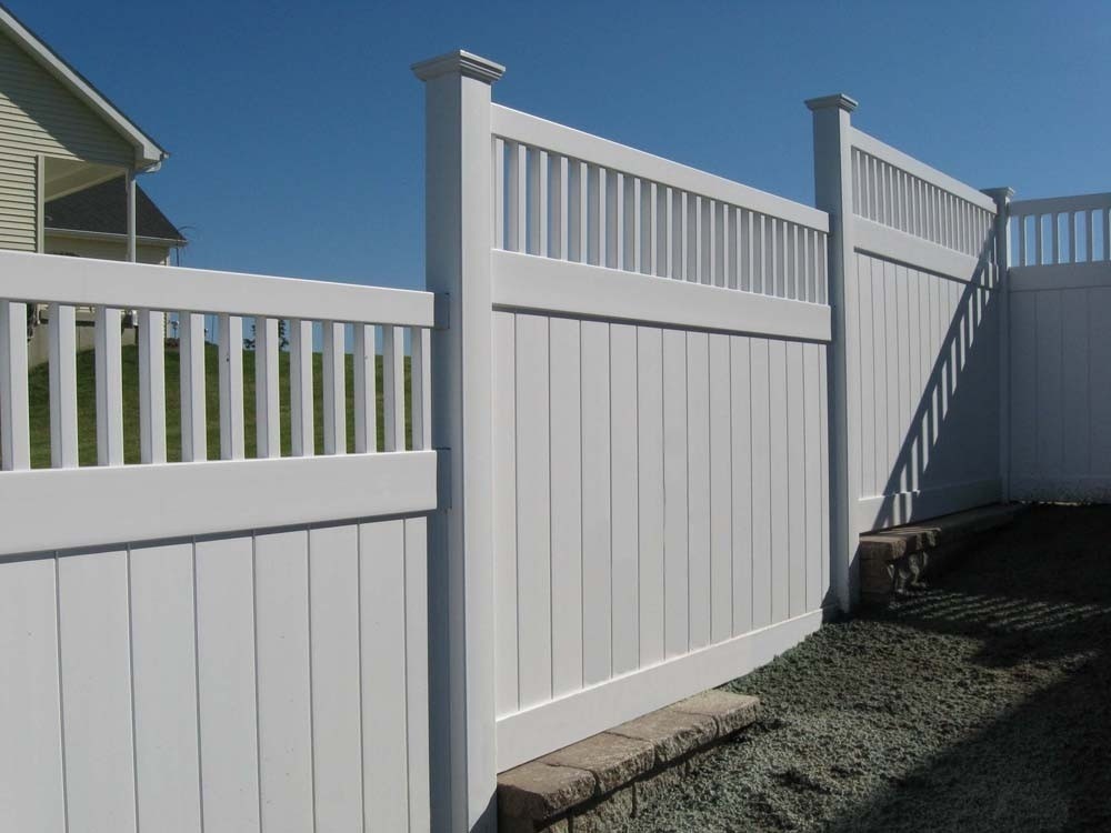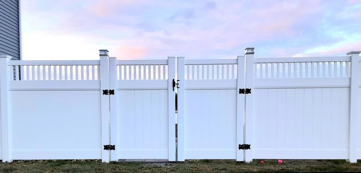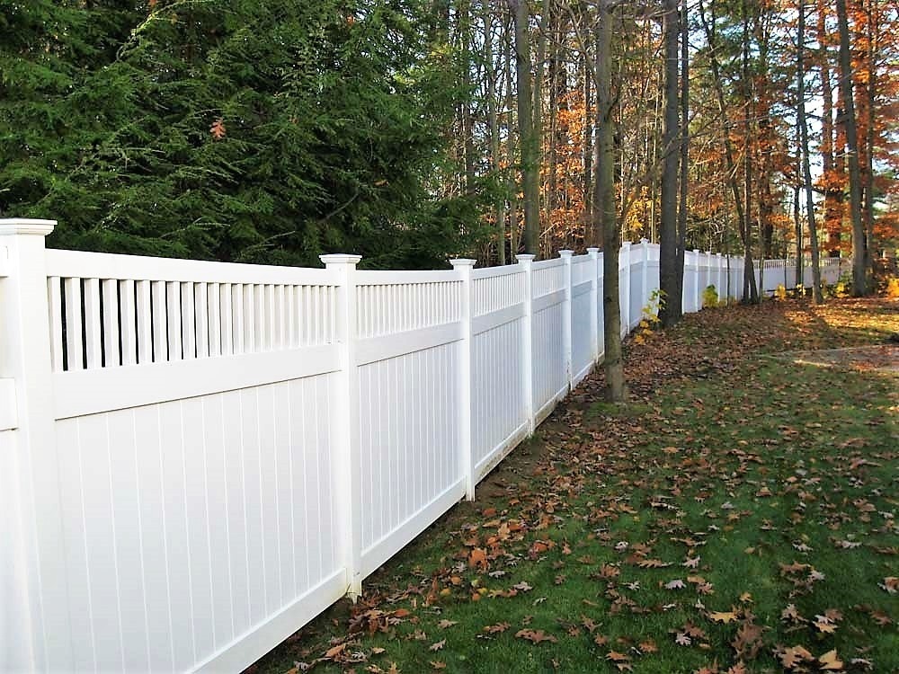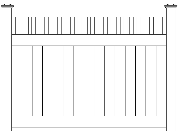 New England privacy fence has a picket row giving it a clean modern look. This attractive vinyl fence style is built strong with 2” x 7” decorative pocket rails, 6″ wide vertical boards, and metal reinforced bottom rail.
