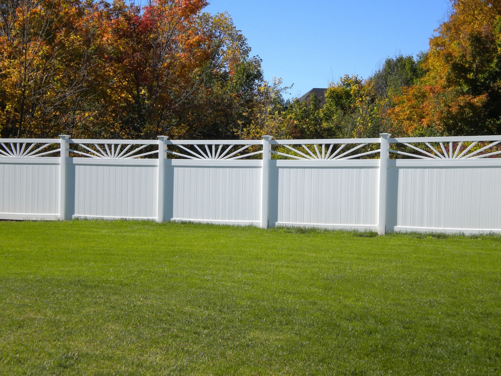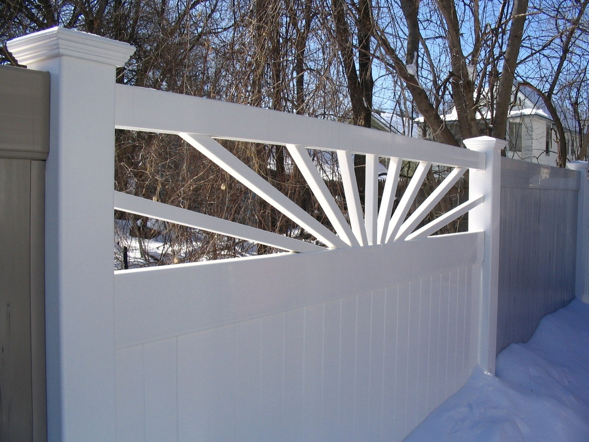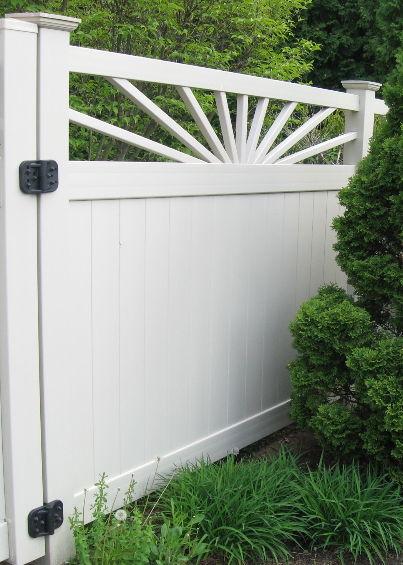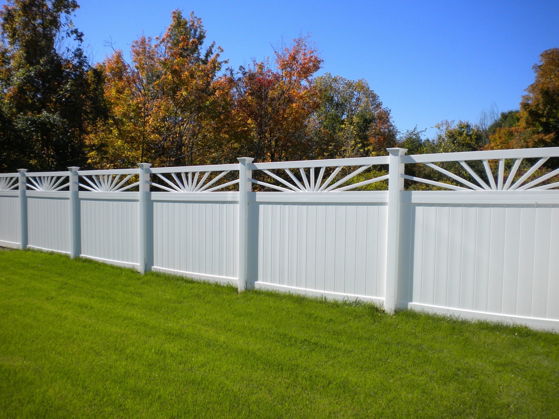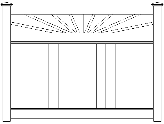 Its always a sunny day with your cheerful Sunburst privacy. The pickets on top simulate the suns rays. Made with Sunburst privacy fence has a spoke-like picket top, imitating the rays of the sun. This vinyl fence style is built with 2” x 7” decorative pocket rails, 6″ wide vertical boards, and metal reinforced bottom rail.