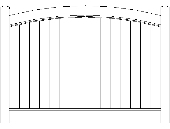 Crescent 1 has an arch shaped top that appears to mirror rolling hills. This unique vinyl fence style is built with modified 2” x 7” or 1.5” x 5.5” pocket rails, 6″ wide vertical boards, and metal reinforced bottom rail.