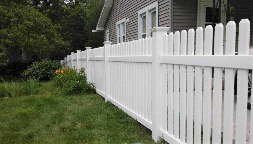 This “good neighbor fence” looks great on both sides because the pickets run through the rails. The 1 3/4″ spaced pickets have “dog ear” caps and are level across the top. Made with 3″ wide pickets, 3 1/2″ rails, and a metal reinforced bottom rail. For wider picket spacing see the “Cape Cod 1” fence style.