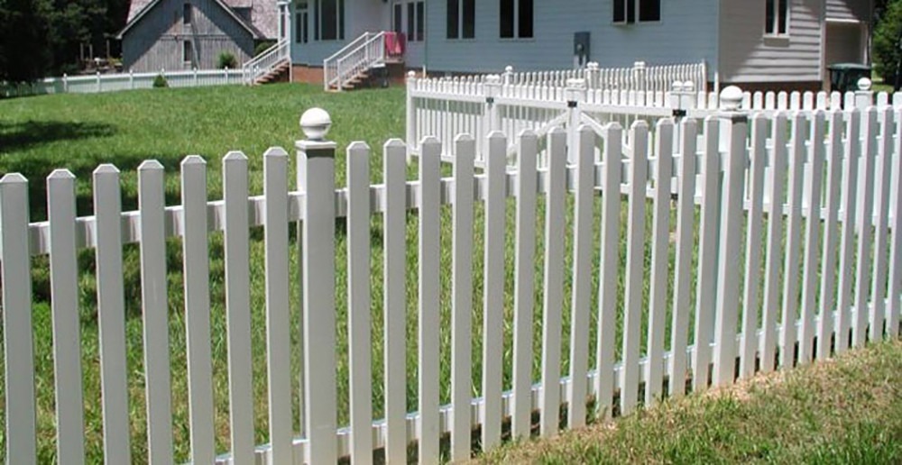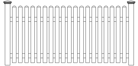 The pickets are attached to the outside of the rails with hidden fasteners. The 1 3/4″ spaced pickets have “dog ear” caps and are flat across the top. Made with 3″ wide pickets, 3 1/2″ rails, and metal reinforced bottom rail.