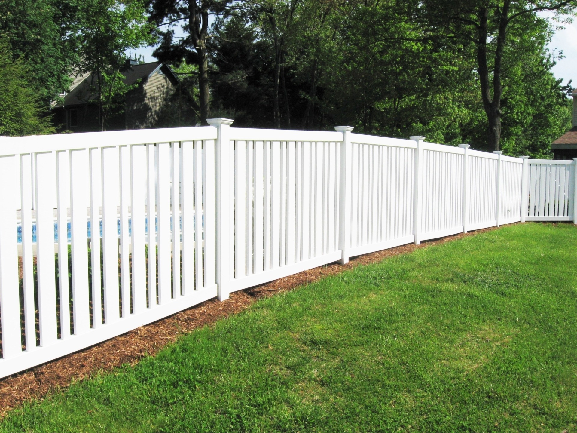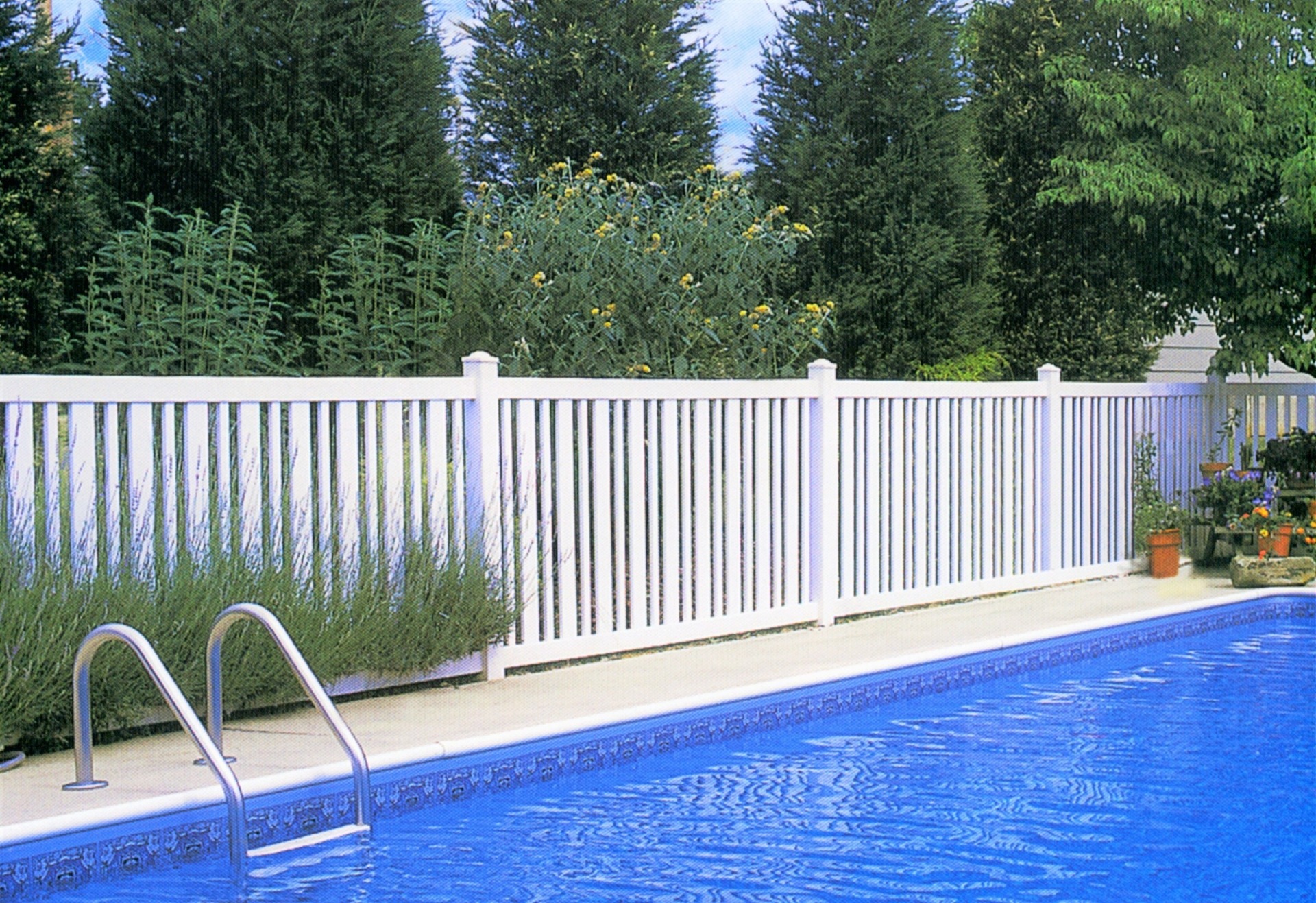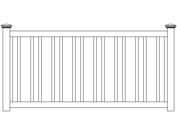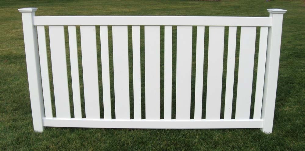 The Adirondack vinyl fence has alternating 3″ and 6″ pickets spaced 1 3/4″ apart. Made with 3 1/2″ rails, and a metal reinforced bottom rail.