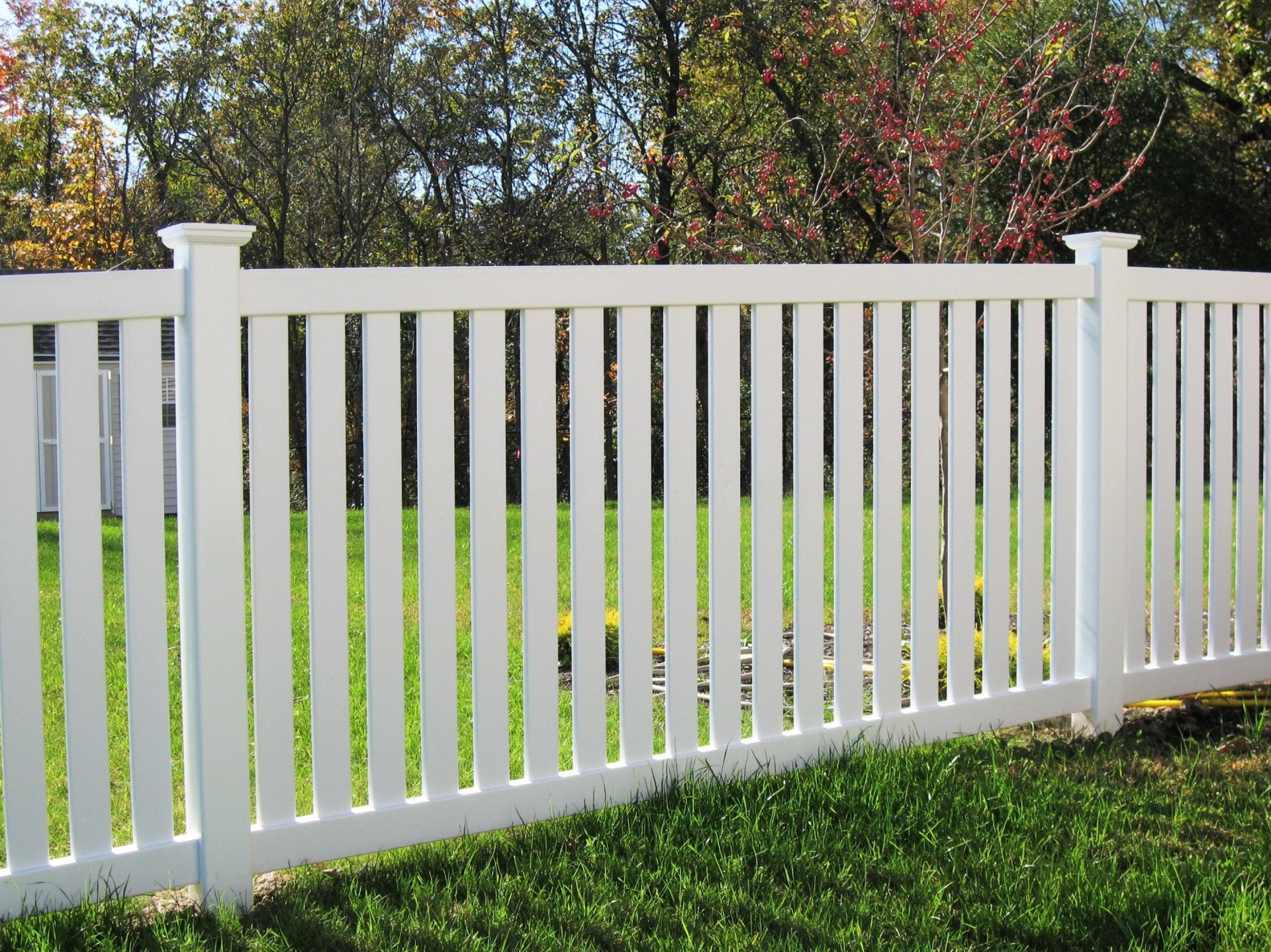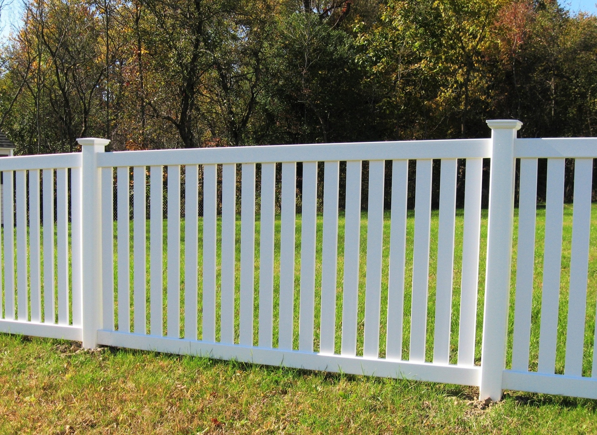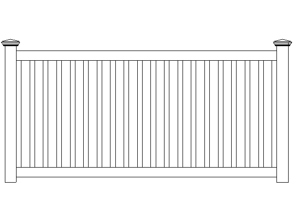 The Ticonderoga makes a good “puppy fence” because of the tighter spacing between pickets. The 3″ wide pickets are spaced 1 3/4″ apart. Made with 3 1/2″ rails and a metal reinforced bottom rail.